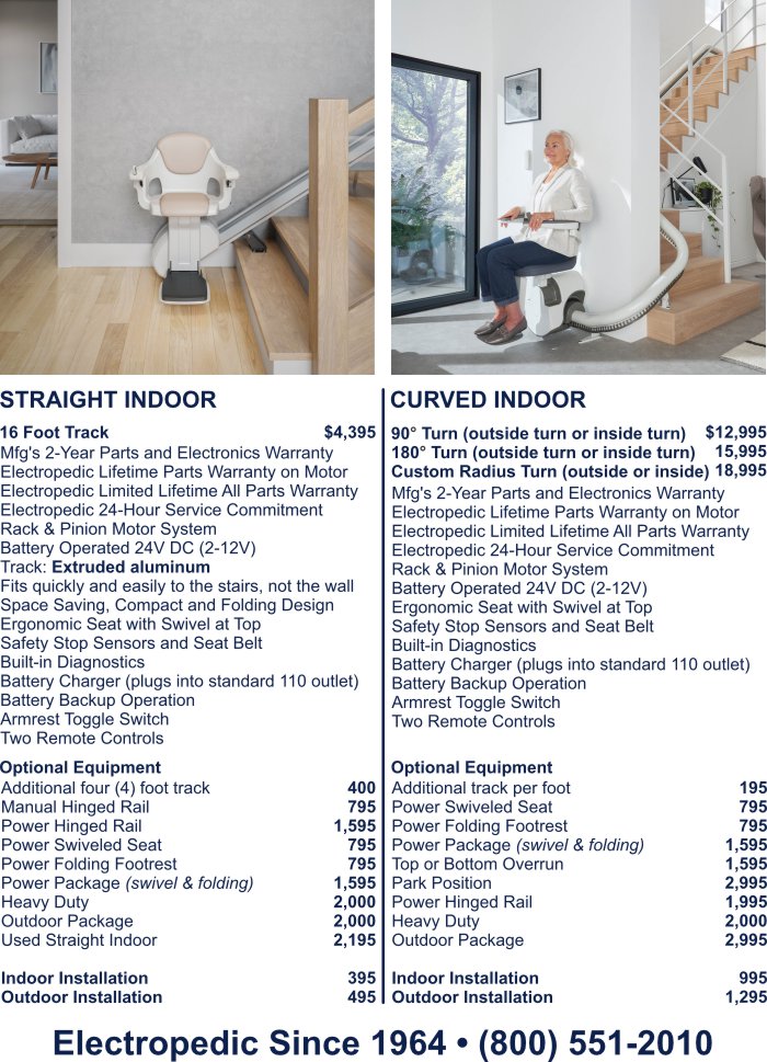 New & Used | Buy, Sell & Trade | Rent, Own & Finace | USED 1/2 OFF REG. PRICEBuying a used stair lift from Electropedic offers several advantages, benefits, and features. Their pre-owned stair lifts are thoroughly inspected and refurbished to ensure high-quality performance, providing a cost-effective solution for those in need of mobility assistance. Customers benefit from substantial savings compared to new models, while still receiving a product with reliable functionality and durability. Electropedic's used stair lifts come with warranty options, offering peace of mind, and their team provides expert installation and support. Additionally, they offer a variety of models to suit different needs and stair configurations, making it easier to find a suitable solution for any home. PLEASE CALL FOR A FREE QUOTE: 800-233-7382. |